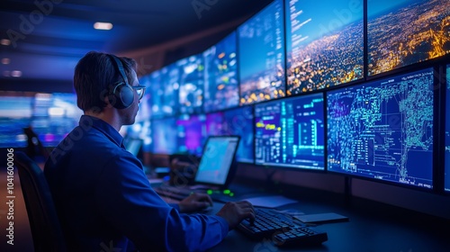Tech Professional Analyzing Data on Multiple Monitors in High-Tech Control Room.