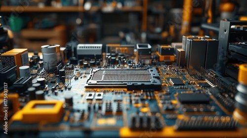 Tech workbench with computer motherboard, soldering iron, digital thermometer, showcasing electronic assembly and repair tools