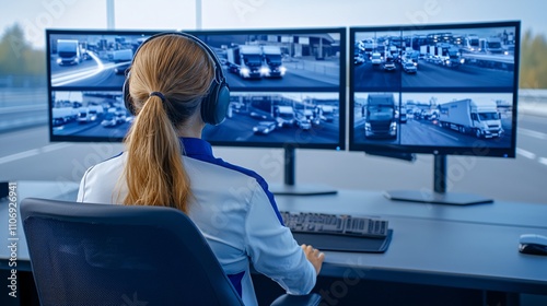 Tech-focused traffic monitoring technician operating multiple screens in city center