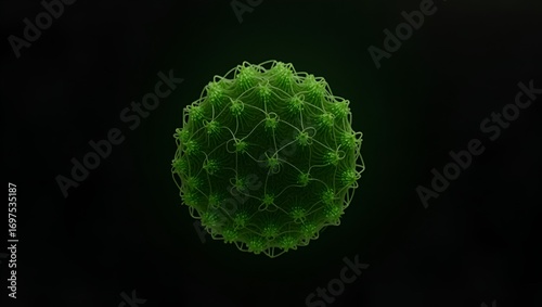 Tech-inspired design of a green gradient mesh sphere with overlapping rings and smooth lighting. Set against a dark backdrop, it conveys futuristic energy with an organic ecological touch
