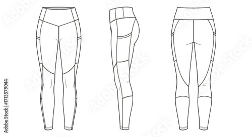 Technical drawing of leggings in three views, isolated on transparent background for fashion design and activewear purposes