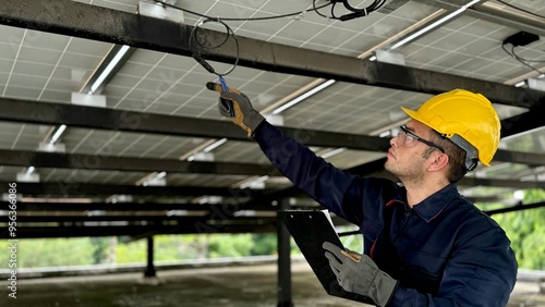 Technical engineer Inspecting the installation of the solar panels and checking the integrity of all wires connected to the solar panels. for the system to work properly