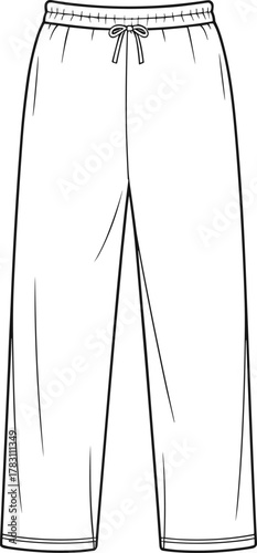 Technical fashion sketch of jogger pants front view with elastic waistband, drawstring, relaxed fit, and garment construction details