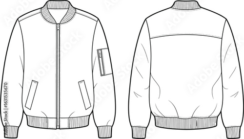 Technical jacket drawing, front and back view, fashion sketch, ribbed collar, sleeve pocket, zipper closure, garment blueprint, apparel template, clothing design illustration.