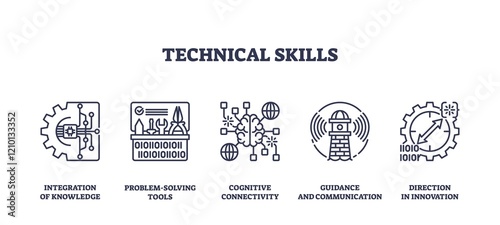 Technical skills icons depict integration, problem-solving, and innovation. Outline icons set.