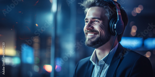 Technical support worker. Phone tech support. Friendly. Handsome. Computer help, with a smile. Man wearing a headset. Man on the phone. Customer service. Customer support. Call centre worker.