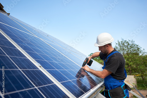 Technician connecting solar panel to metal platform using electrical screwdriver on blue sky copy space background. Stand-alone solar system installation, efficiency and professionalism concept.