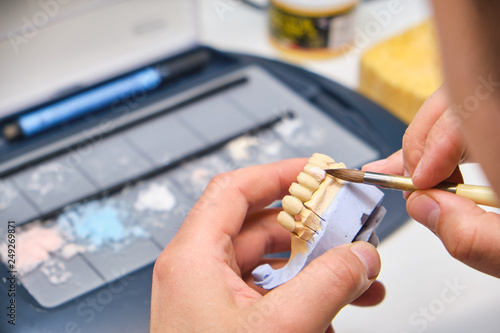 Technician dental is working with complete lower and upper metal ceramic prosthesis dental. Dental technician works by brush with jaw model