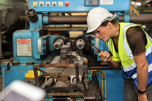 Technician engineer or worker man in protective suit standing and using walkie talkie radio while controlling or maintenance operation work lathe metal machine at heavy industry manufacturing factory