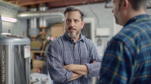 Technician explaining HVAC system to homeowner