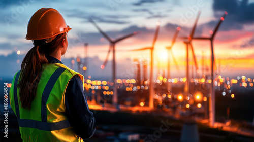 technician in safety vest and helmet observes offshore wind turbines at sunset, reflecting on importance of renewable energy