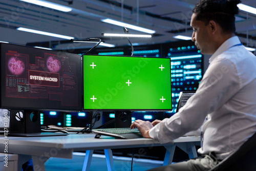 Technician in server farm using isolated screen PC to stop hacker passing company firewall and stealing sensitive user data. IT staff member looking at chroma key computer, seeing security breach