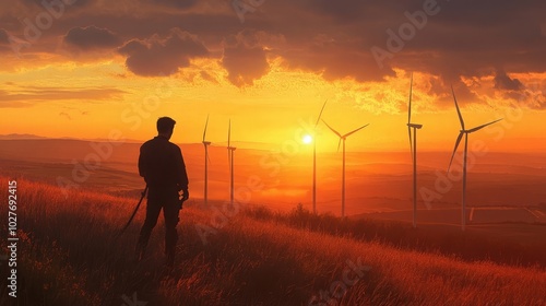 Technician inspecting wind turbines at sunset