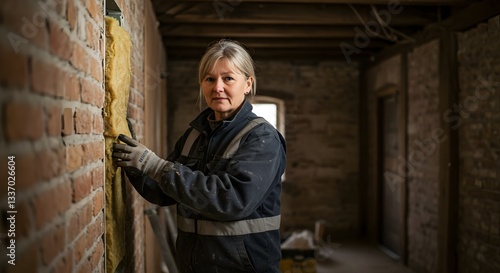 Technician Installing New Insulation in Older Building for Energy Savings (Industry)