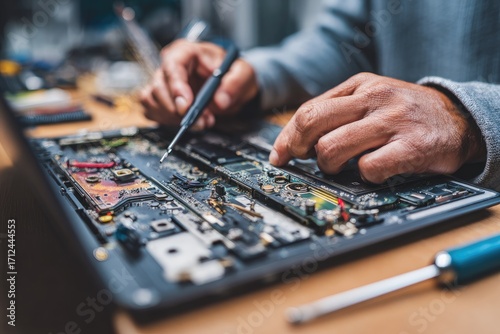 Technician repairing a laptop computer motherboard with a screwdriver.