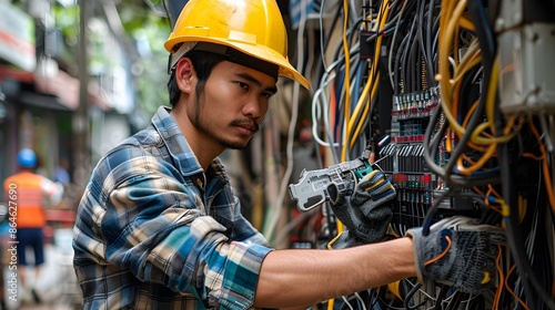 Technician Repairing Cables at an Urban Outdoor Site on a Sunny Day