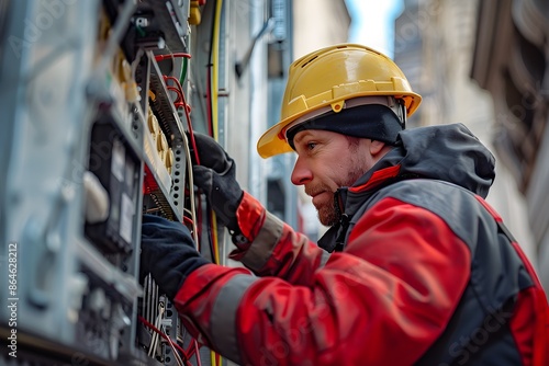 Technician Repairing Cables at an Urban Outdoor Site on a Sunny Day