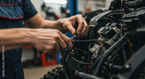Technician repairing wiring in vehicle engine