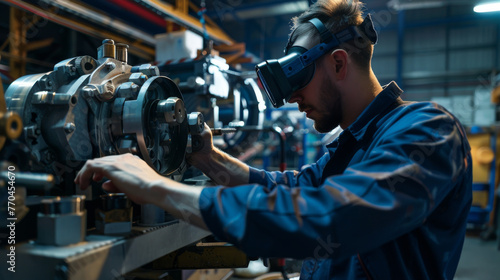 technician wearing a head-mounted display repairs a complex piece of machinery using remote assistance technology