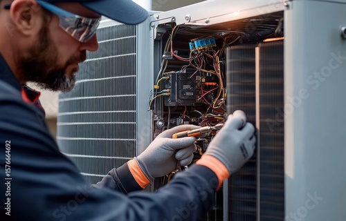 Technician wearing gloves and protective glasses repairing or inspecting the intricate wiring inside an air conditioning unit