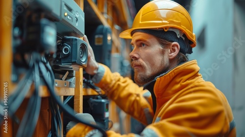 Technician worker installing video surveillance camera. CCTV camera closeup. Video surveillance camera in hands of technician. Installation of outdoor video surveillance in close-up.