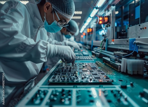 Technicians assembling circuit boards, cleanroom environment, high-precision electronic manufacturing