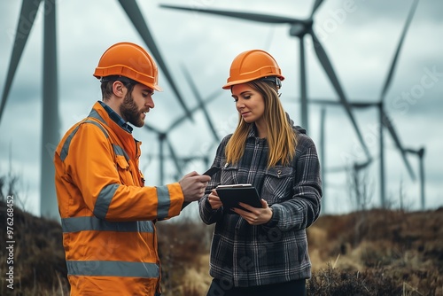 Technicians working on a wind turbine with blades slowly turning in a breeze, reflecting innovation in sustainable electricity