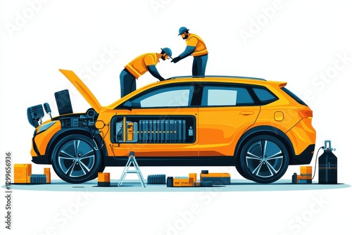 Technicians Working on Electric Car Battery Inside Workshop