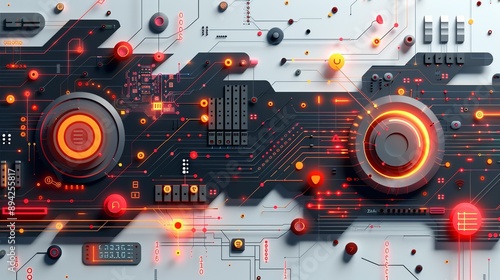 Technological innovation concept with abstract circuit patterns and binary code. Minimalist UI in a flat illustration style on a white background with bright Color scheme, dribble, flat Illustration