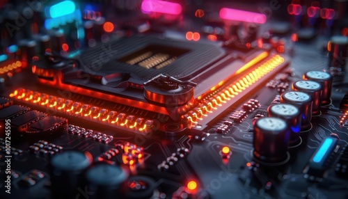 Technological innovation with futuristic gadgets, high-tech, neon lights, digital art, detailed