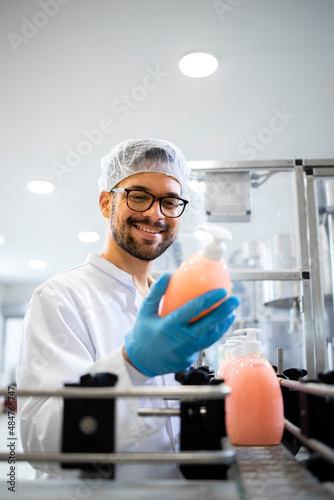 Technologist working in chemical industry checking quality and production of liquid soap in factory.