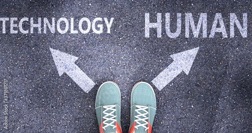 Technology and human as different choices in life - pictured as words Technology, human on a road to symbolize making decision and picking either Technology or human as an option, 3d illustration