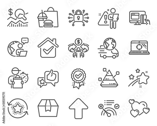 Technology icons set. Included icon as Seo laptop, Sharing economy, Heart signs. No internet, Security lock, Package box symbols. Pyramid chart, Check investment, Like. Delivery service. Vector