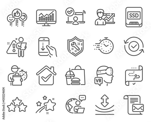 Technology icons set. Included icon as Success business, Augmented reality, Target path signs. Spanner, Online access, Mail letter symbols. Security confirmed, Resilience, Ranking stars. Vector
