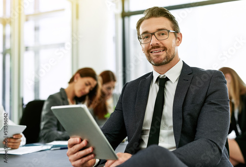 Technology makes our meetings more productive. Portrait of a businessman using a digital tablet during a meeting in a boardroom.