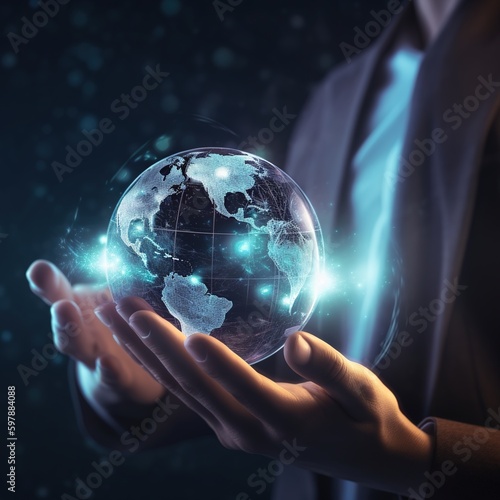 Technology of the future.Science, innovation, and communication technology are all part of the global networking connection.Hand holding a globe of the Earth. generative ai