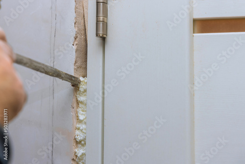 Technology on construction foam between the wall and the door frame a home under reconstruction