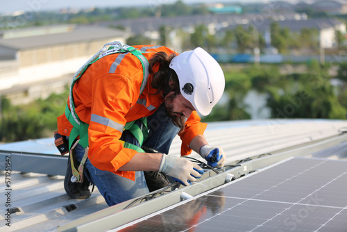 Technology solar cell, Engineer service check installation solar cell on the roof of factory. technician checks the maintenance of the solar panels