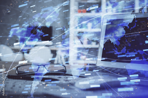 Technology theme drawing and table with computer. Multi exposure. Concept of information.