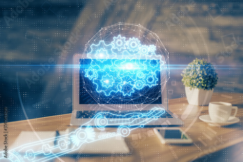 Technology theme drawing and work space with computer. Double exposure. Concept of innovation.