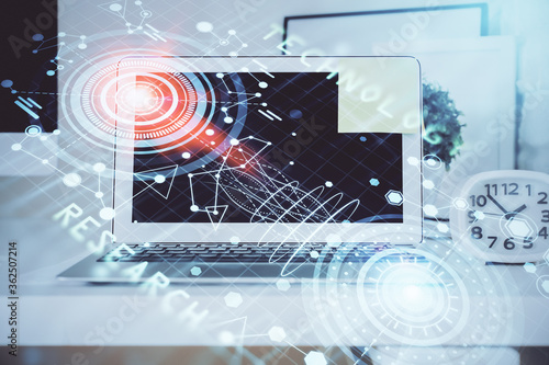 Technology theme drawing and work space with computer. Double exposure. Concept of innovation.