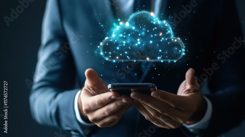 Technology transformation concept showing businessman holding mobile phone with virtual cloud computing.
