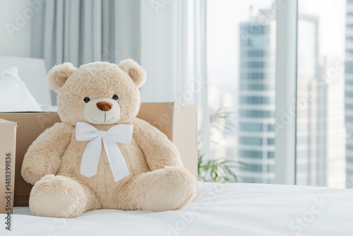 Teddy Bear in New Home: A large, beige teddy bear with a white bow sits on a bed, next to neatly stacked cardboard boxes, gazing out a large window at a cityscape.