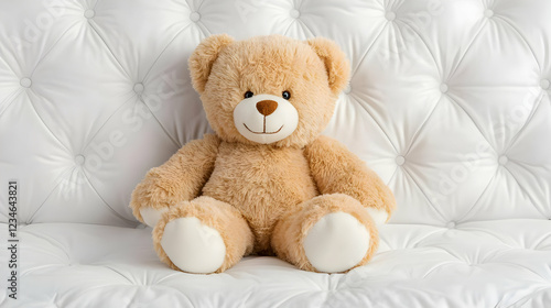 Teddy bear sitting on white sofa, home decor