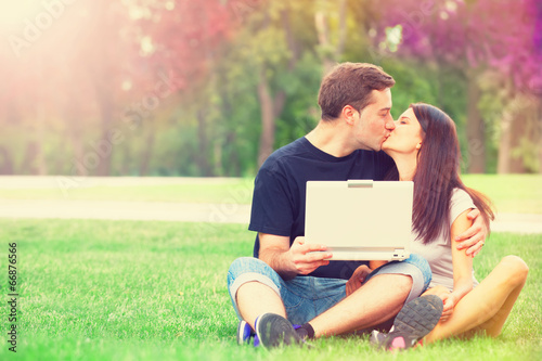 Teen couple with notebook in the park