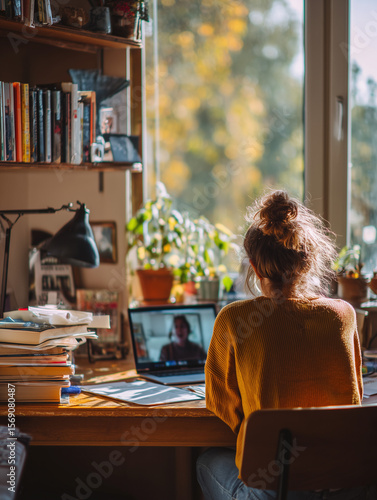 Teen girl studying online at home with laptop and textbooks — distance education and remote learning