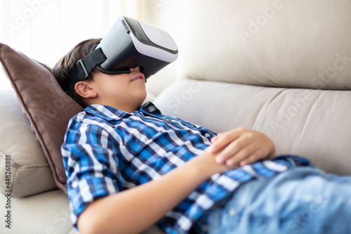 Teenage boy enjoying the virtual reality experience lying on the couch at home.