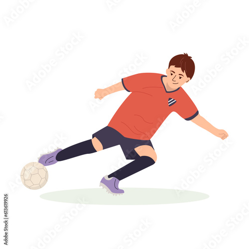 Teenage boy football player, in a red sports shirt, kicks a soccer ball. Kid sportsman playing football game, dynamic practicing. Cartoon vector illustration in flat style isolated.