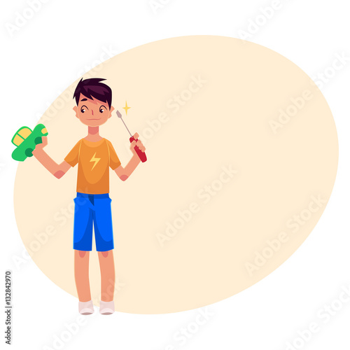 Teenage boy holding screwdriver, trying to fix, repair a toy car, cartoon vector on background with place for text. Full length portrait of boy holding screwdriver and a toy car, repair concept