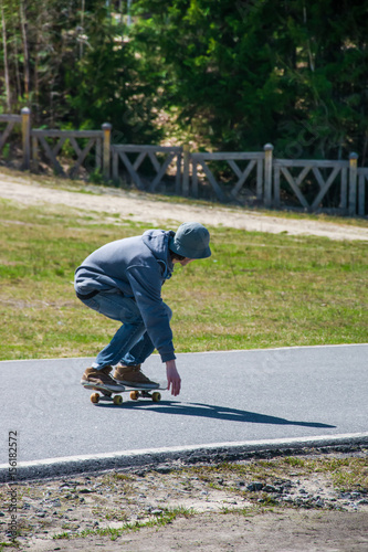 Teenage boy rides a skateboard on the asphalt road